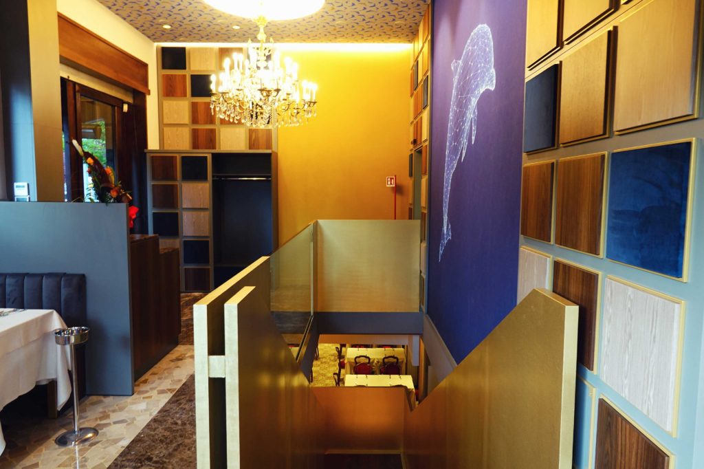 Il nuovo gioiello è un raffinatissimo ristorante curato nei minimi dettagli: l’arredamento nelle tonalità tipiche del legno si sposa col colore dominante, ossia l’azzurro del mare, impreziosito da dettagli dorati, per una proposta di design classica-moderna particolarmente esclusiva e accattivante in tutte le sue ambientazioni.